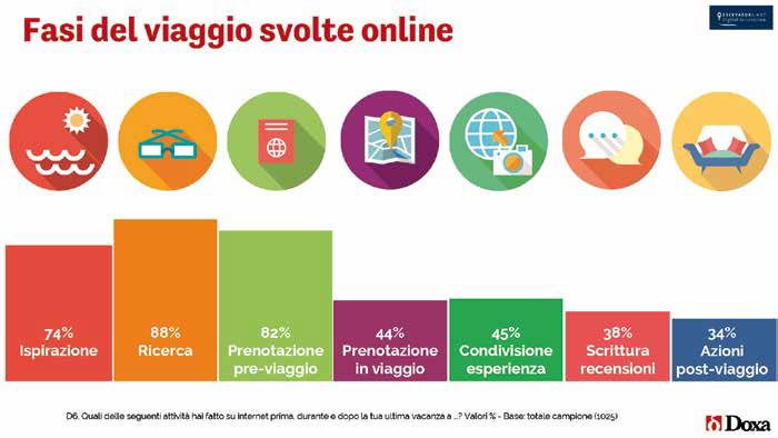 Dalla ricerca è emerso che il Turista Digitale italiano è particolarmente attivo su Internet in tutte le macro-fasi del viaggio: nei momenti pre-viaggio, l’88% ricerca informazioni e l’82% prenota o acquista qualcosa; durante il viaggio il 44% acquista su Internet qualche attività e l’86% utilizza applicazioni in destinazione a supporto dell’esperienza; il 61% fa attività digitali nel post-viaggio.