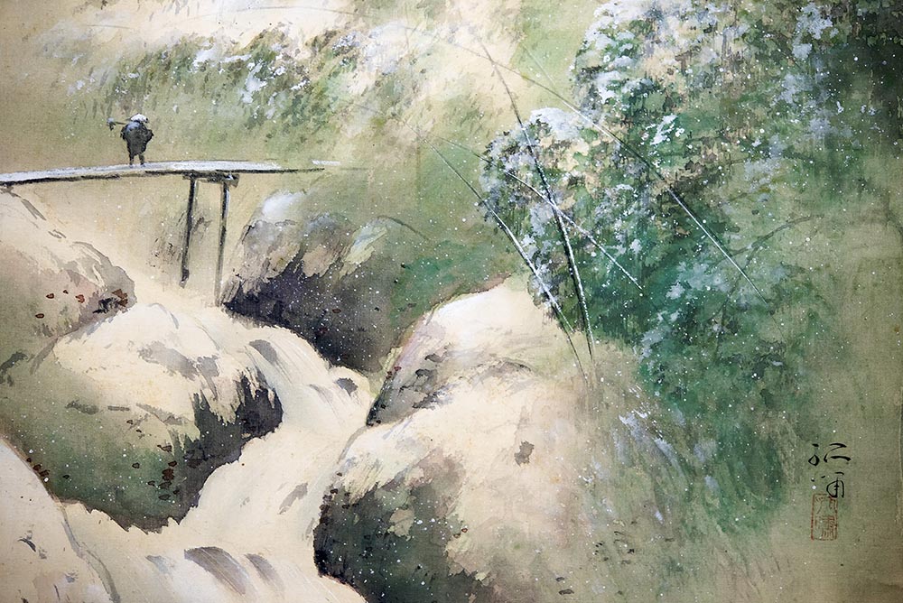 Paesaggio innevato con figura, Periodo Meiji (1868-1912), rotolo verticale dipinto a inchiostro e colori su seta